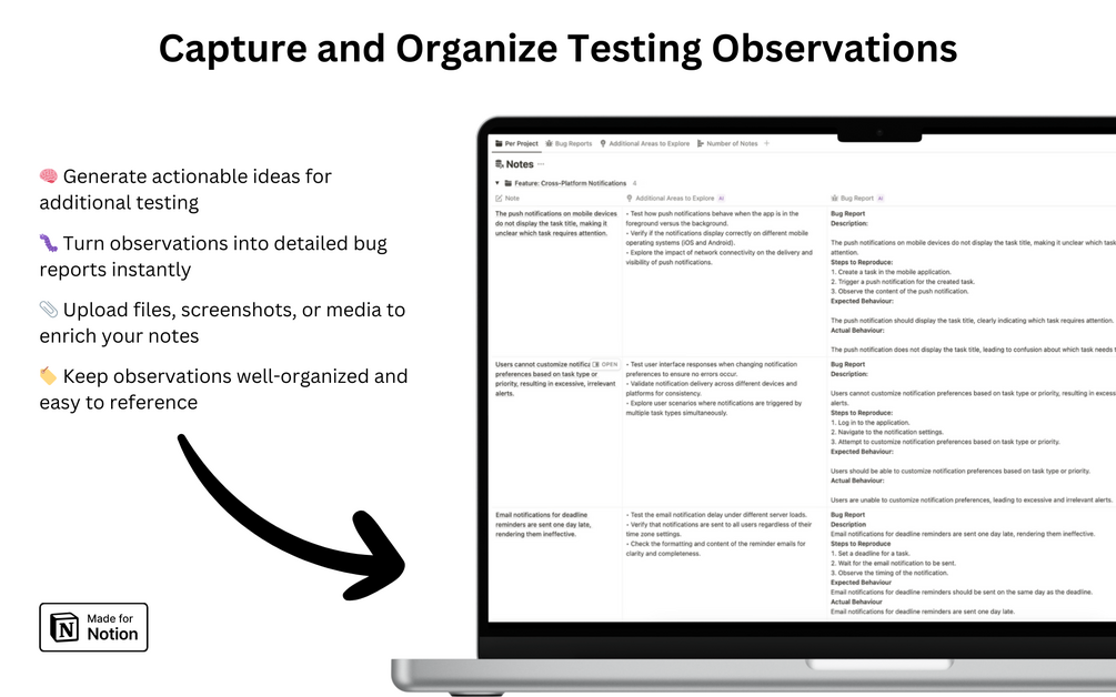 • 🧠 Suggestions for Enhanced Coverage: Use Notion AI to receive actionable suggestions for additional areas to explore, ensuring that your testing sessions are thorough and leave no stone unturned.