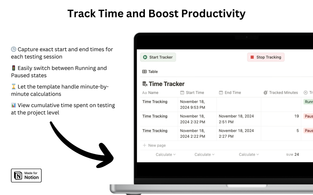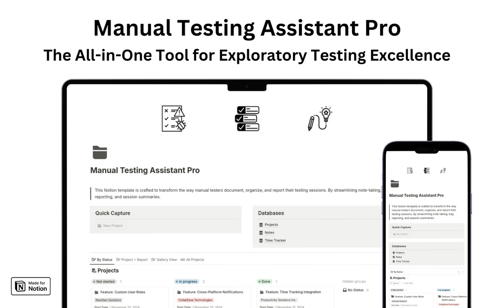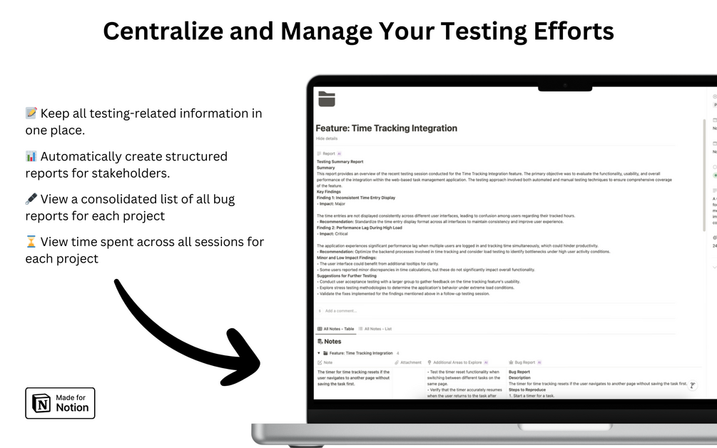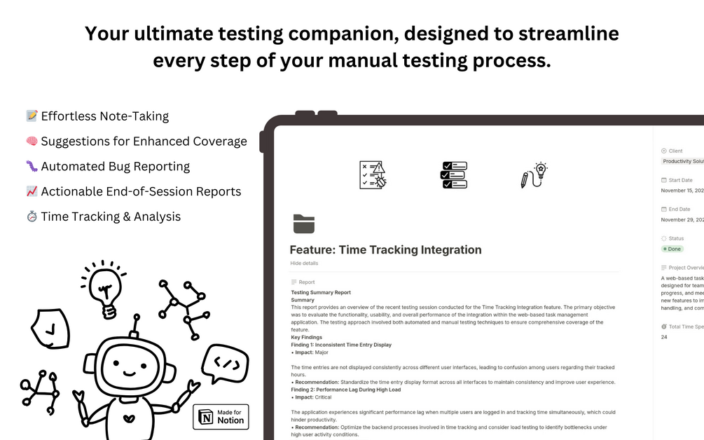 🚀 Transform your manual testing process with this comprehensive Notion template. Track time, document notes, generate bug reports, and create structured session summaries—saving time and improving software quality.